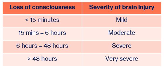 The severity of a brain injury can often be gauged by the duration of time a patient spends in a coma. The following table outlines the correlation between the length of unconsciousness and the corresponding severity of brain injury: