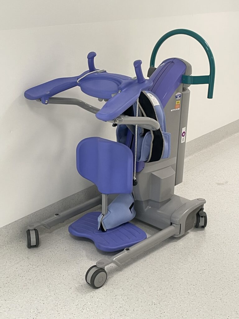 It’s a special standing machine called a ‘Sara Plus’. It helps to safely move someone from things like a bed to a wheelchair, when they need help to stand.