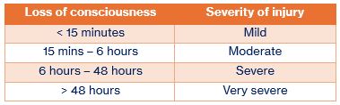 The Severity of a brain injury can often be gauged by the duration of time a patient spends in a Coma . The following table outlines the correlation between the length of unconsciousness and the corresponding Severity of brain injury:
