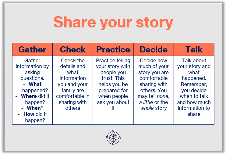 After a brain injury, it is important to understand what happened as it is normal to have people ask you about it. We recommend you work through the process below to decide when, how and who you would like to tell none, some, or all of your story to. Remember, just because someone asks, you don’t need to tell them.